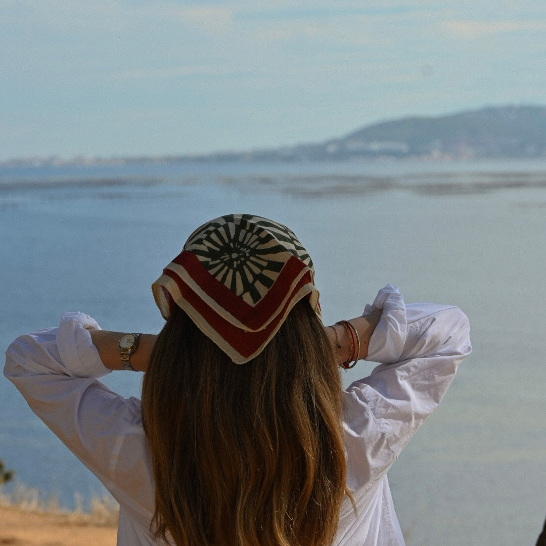 Imprimé à la main : réalisé selon la technique traditionnelle du block print en Inde. Chaque tampon en bois est appliqué à la main avec des teintures naturelles, donnant à chaque bandana un caractère unique.
